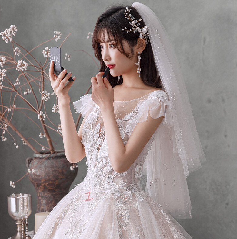Krátký rukáv Přikrýt Kostel Trojúhelník A-Čára Svatební šaty #C2206957