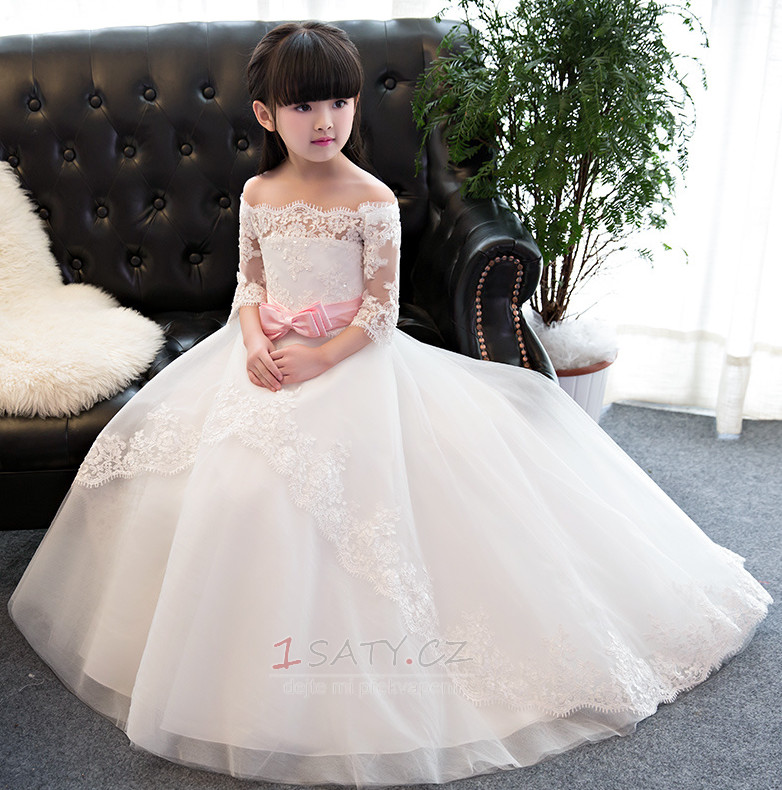 Domů Květinové dívky šaty Květinářka Šaty KrajkaA-Čára Přírodní pas Luk Krajka Krajkou Overlay Květinové šaty